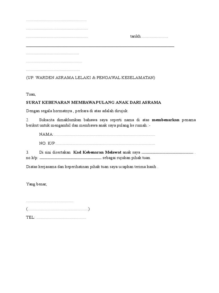 Contoh Surat Kebenaran Bawa Anak Pulang Asrama Pdf